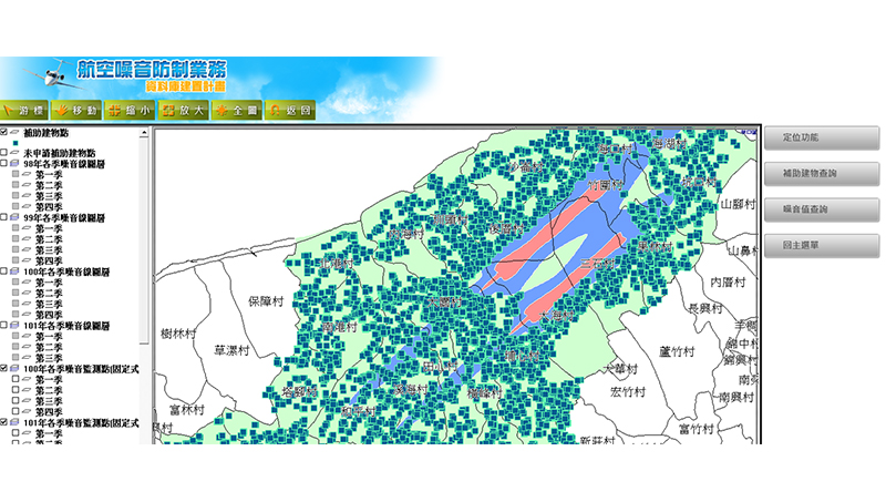 桃園市政府環境保護局為能有效執行航空噪音防制經費補助作業及管理回饋金補助作業之相關管理作業,於100年度計畫已初步透過地理資訊系統技術,整合桃園市政府環境保護局各年度公告桃園國際機場航空噪音防制區圖及近三年桃園國際機場航空噪音等噪音線變化情形,並完成航空噪音防制經費補助系統之基礎資料庫建置工作。