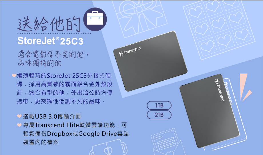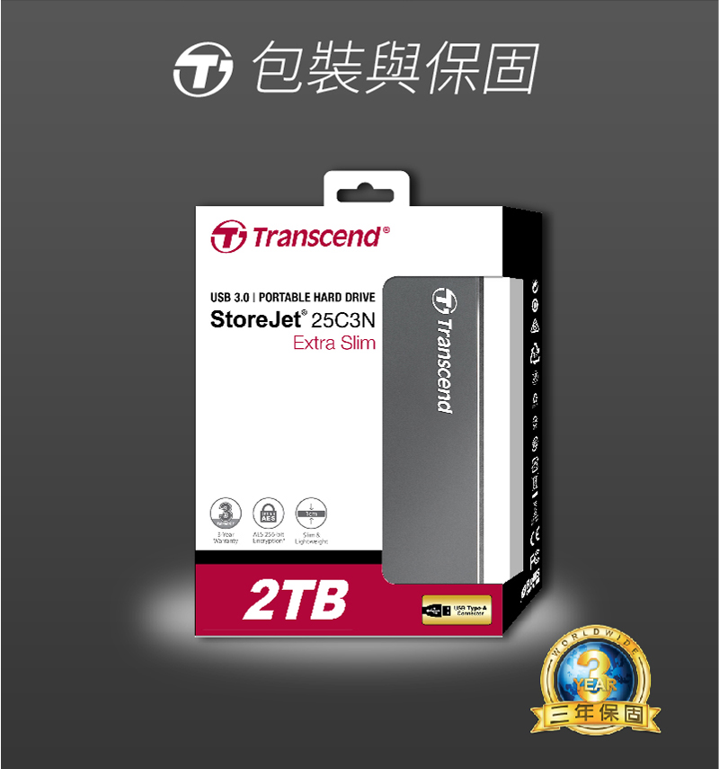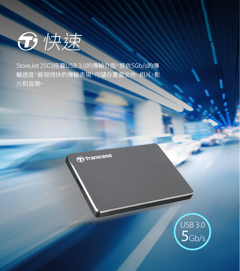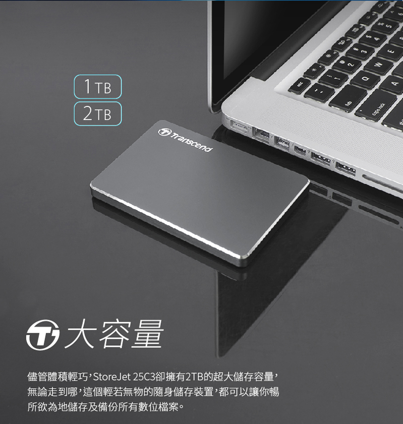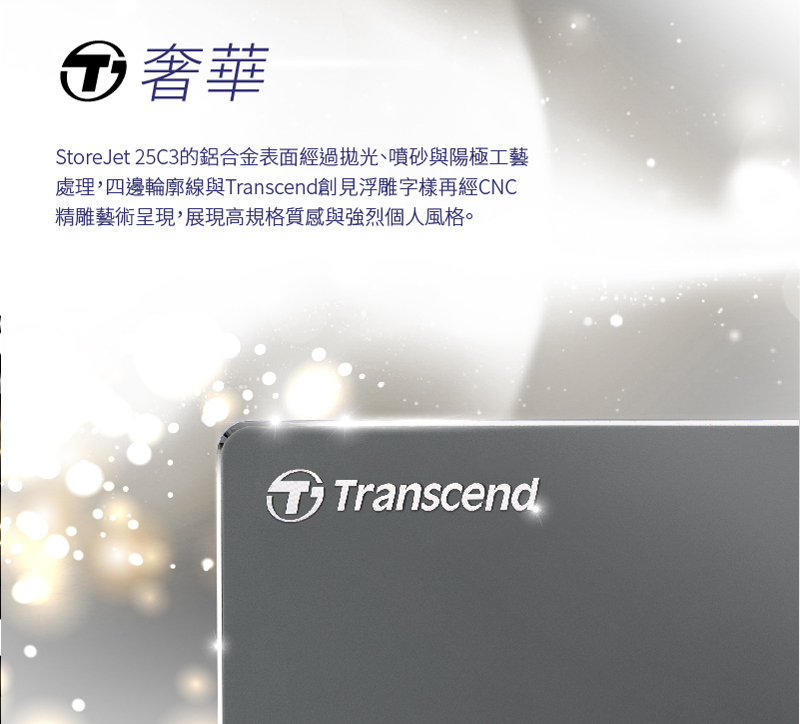奢華撼動你的五官,讓指尖觸動你對奢華的感受。StoreJet 25C3是一款採用鋁殼設計的外接式硬碟,纖薄輕巧,方便攜帶。Transcend Elite雲端功能讓你可以輕鬆備份儲存於Dropbox或Google Drive雲端裝置內的檔案到StoreJet 25C3,兼具實用功能與時尚美感。
