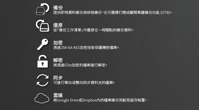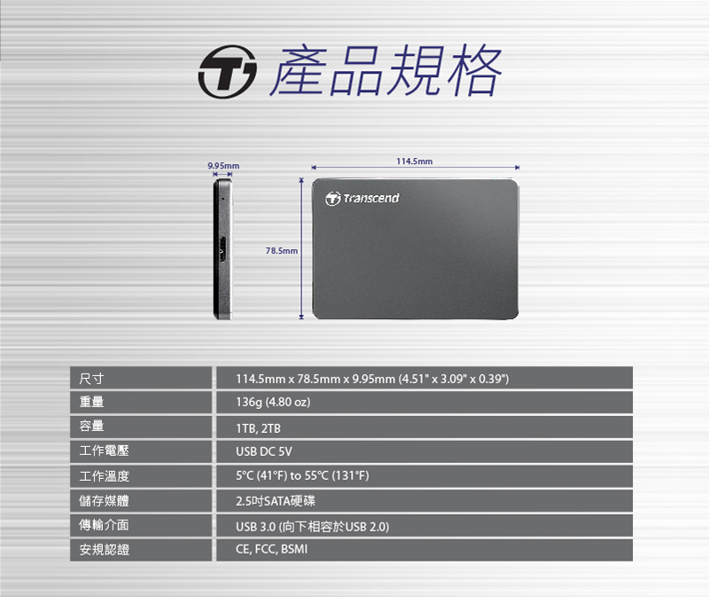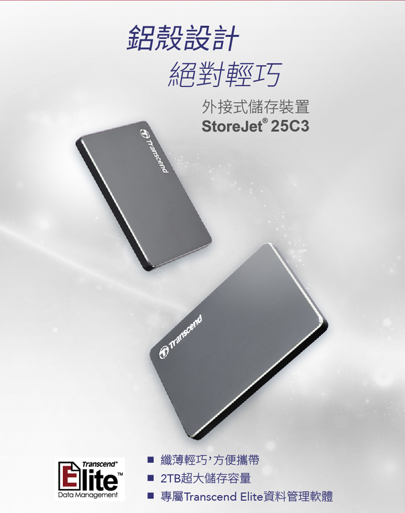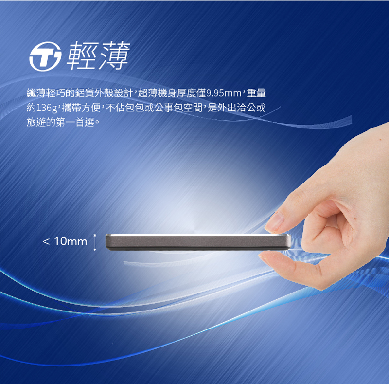 外接式硬碟。鋁質外殼設計,超薄機身厚度僅9.95mm,攜帶方便不佔包包或公事包空間。專屬Transcend Elite的雲端功能可以輕鬆備份儲存於Dropbox或Google Drive雲端裝置內的檔案,是外出洽公或旅遊的第一首選。