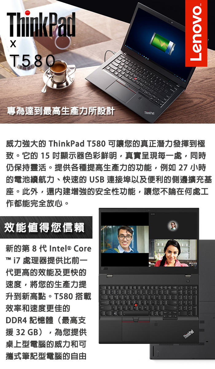 新的第 8 代 Intel® Core™ i7 處理器提供比前一代更高的效能及更快的速度,將您的生產力提升到新高點。T580 搭載效率和速度更佳的 DDR4 記憶體(最高支援 32 GB),為您提供桌上型電腦的威力和可攜式筆記型電腦的自由。