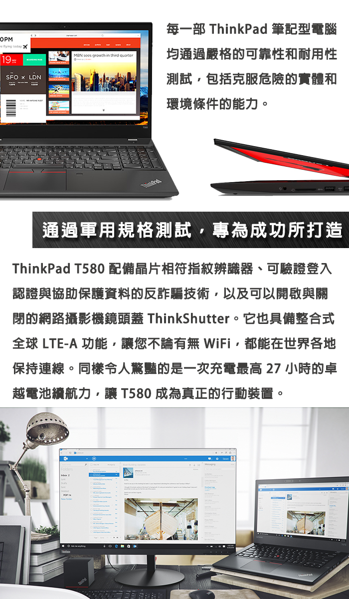 ThinkPad T580 配備晶片相符指紋辨識器、可驗證登入認證與協助保護資料的反詐騙技術,以及可以開啟與關閉的網路攝影機鏡頭蓋 ThinkShutter。它也具備整合式全球 LTE-A 功能,讓您不論有無 WiFi,都能在世界各地保持連線。同樣令人驚豔的是一次充電最高 27 小時的卓越電池續航力,讓 T580 成為真正的行動裝置。