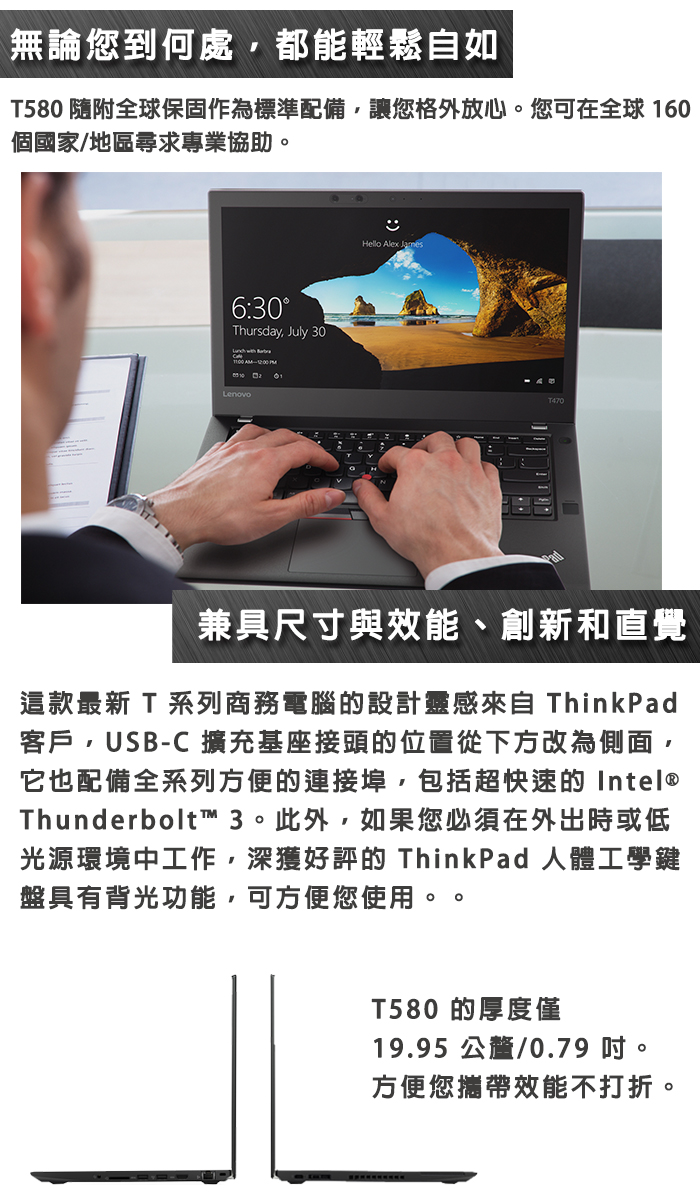 這款最新 T 系列商務電腦的設計靈感來自 ThinkPad 客戶,USB-C 擴充基座接頭的位置從下方改為側面,讓 T580 的厚度僅 19.95 公釐/0.79 吋。它也配備全系列方便的連接埠,包括超快速的 Intel® Thunderbolt™ 3。此外,如果您必須在外出時或低光源環境中工作,深獲好評的 ThinkPad 人體工學鍵盤具有背光功能,可方便您使用。
