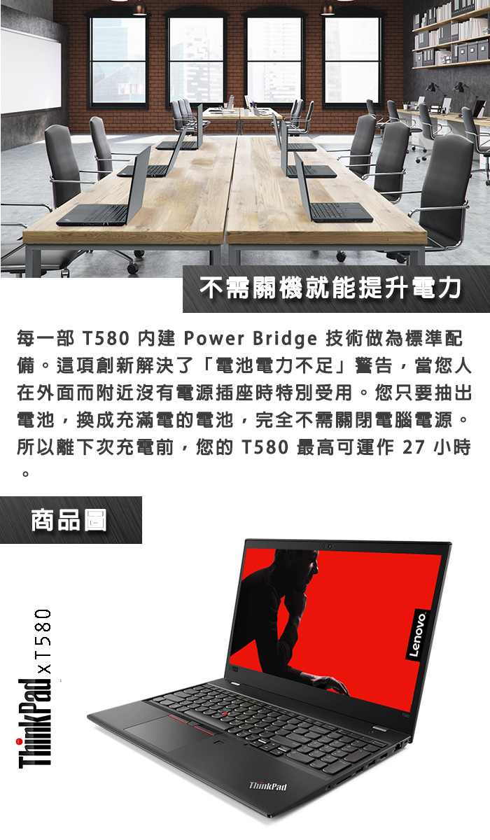 每一部 T580 內建 Power Bridge 技術做為標準配備。這項創新解決了「電池電力不足」警告,當您人在外面而附近沒有電源插座時特別受用。您只要抽出電池,換成充滿電的電池,完全不需關閉電腦電源。所以離下次充電前,您的 T580 最高可運作 27 小時。
