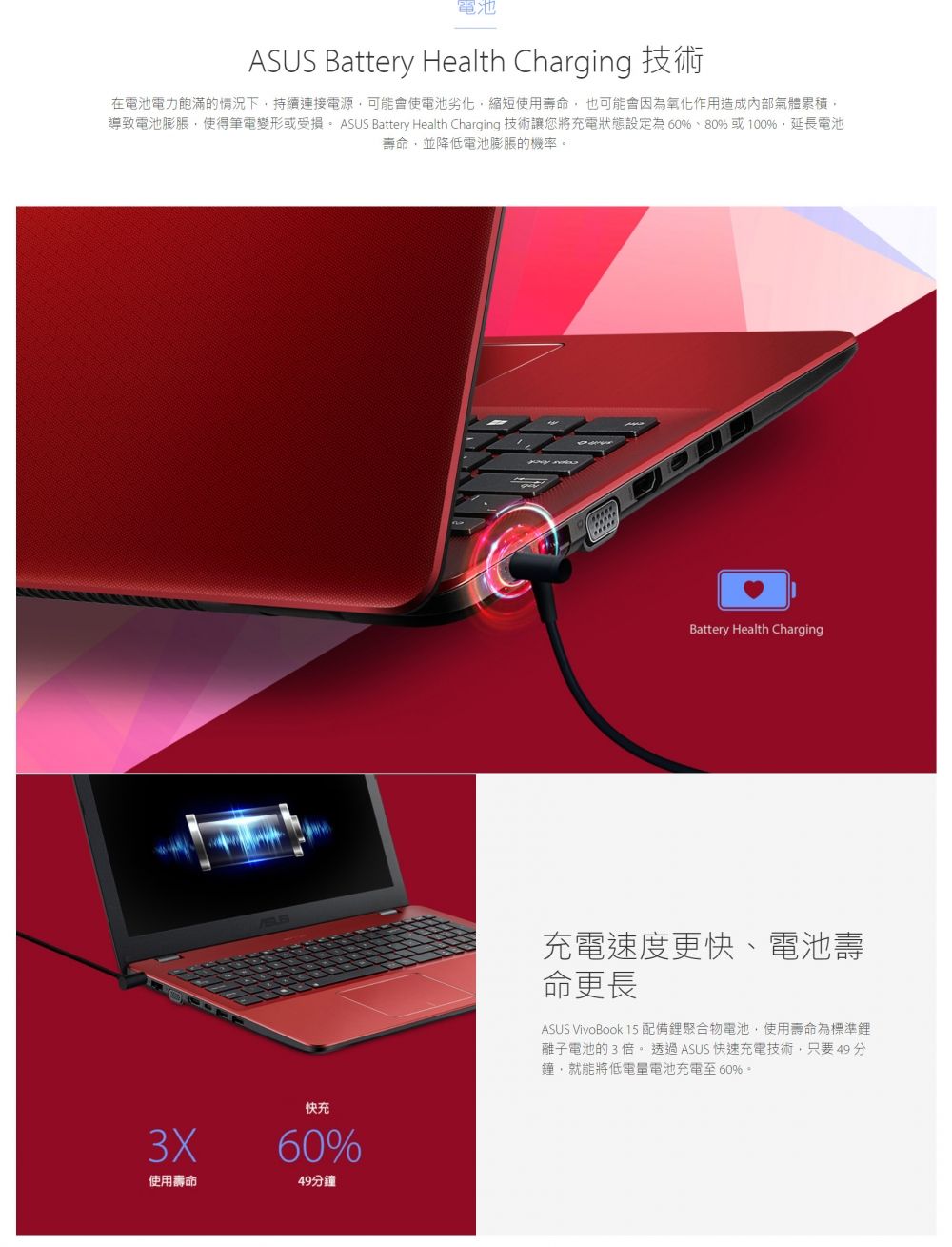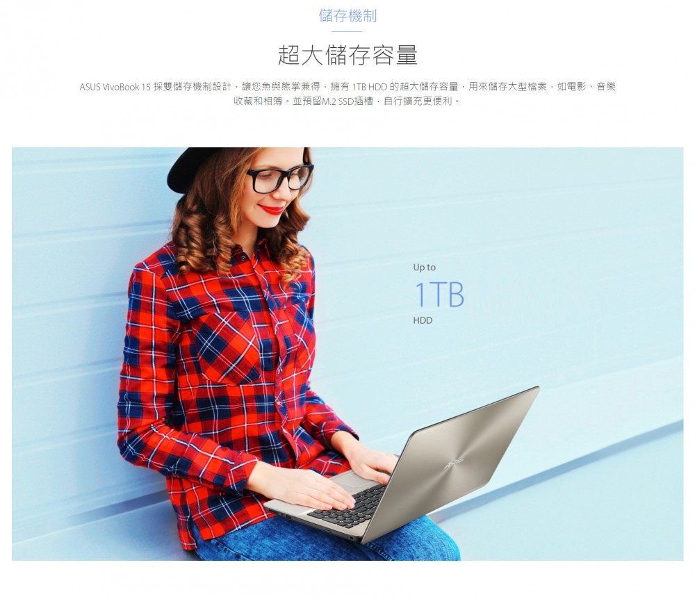 ASUS VivoBook 15 智慧效能 玩美伴侶。時尚多彩,搶眼設計。擁有 1TB HDD 的超大儲存容量,用來儲存大型檔案。ASUS Splendid 視覺最佳化技術針對任何類型的內容呈現最佳視覺效果。護眼模式可過濾藍光,舒緩眼睛疲勞;手動模式則讓您自行調整色彩。